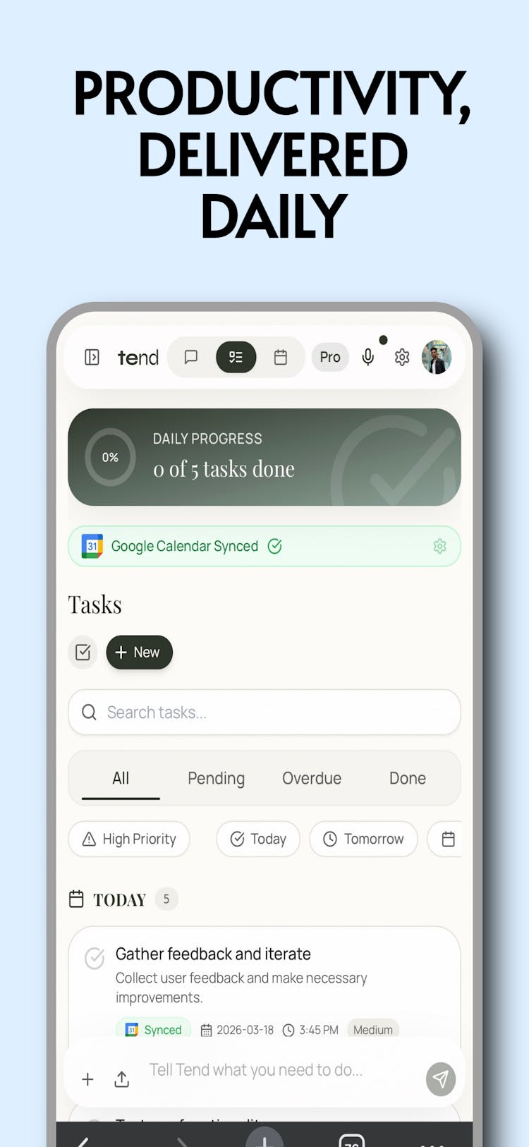 Tend is an AI-powered productivity tool that turns your thoughts into clear, actionable plans. Describe your goal and it generates structured tasks, priorities, and a daily plan to help you stay focused and get things done.