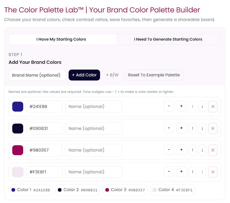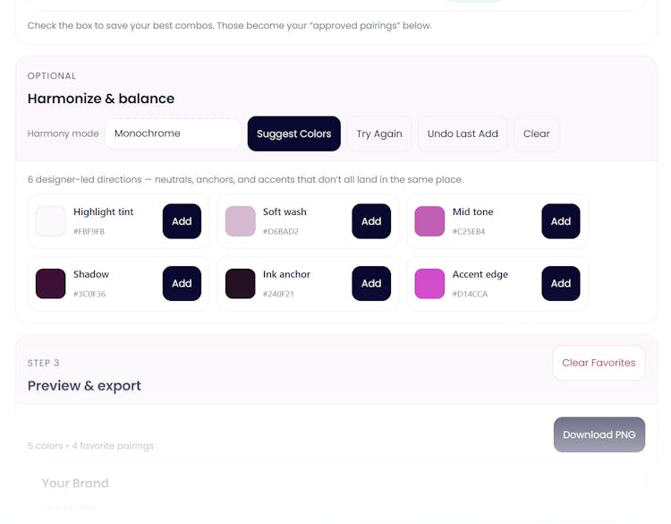Hey! I'm Bonnie, the designer and systems thinker (with an artist brain) behind this tool. Wanted to share a bit more about what The Color Palette Lab™ does, because the description only scratches the surface. Most color tools give you inspiration. This one gives you a working system, and it's fast. Here's the actual workflow: Generate or input your colors — enter hex codes, use the picker, or generate by color family with up to 5 colors locked while you shuffle the rest. Controlled generation, not chaos like the usual suspects. WCAG contrast testing happens in real time as you adjust — no tab switching, no manual math. You see passing and failing pairs immediately, with live UI previews showing how your combinations behave on actual headlines, body text, buttons, and links. The Harmonizer is where it gets interesting. If your palette feels flat, lacks tonal range, or just isn't quite there — you choose a harmony mode (Editorial, Triadic, Monochromatic, Analogous, Complement, Split Complement) and it generates light, mid, dark, and accent tones based on your existing colors. It fills tonal gaps intelligently so your system holds up across layouts. Developers: There's a clean :root CSS snippet at the bottom. Your custom color names feed directly into the variable names. Copy. Paste. Deploy. Export your finalized palette and approved pairings as a PNG for client presentations or handoff. It's creation + testing + refinement + export in one structured flow. Built by someone who's spent years building brand systems and got tired of switching between 5 tools when one thoughtful system could apparently handle it all. Would love your feedback if you try it → http://thecolorpalettelab.com/ *Edited to add the Free Color Palette Playground - a space to truly play with color. https://bonniesorsby.com/color-palette-playground/