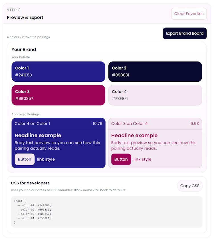 A designer-created palette builder with built-in harmony tools, contrast scoring, shareable boards, and optional CSS root variable export for seamless implementation.