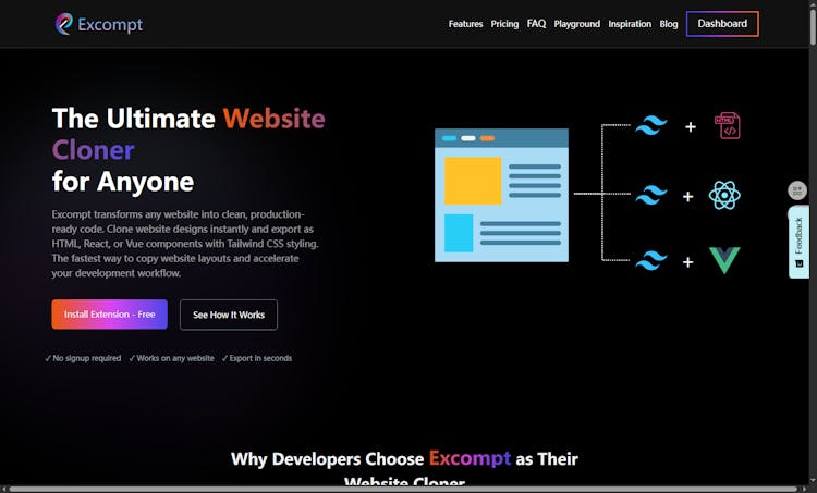 Excompt transforms any website into clean, production-ready code. Clone website designs instantly and export as HTML, React, or Vue components with Tailwind CSS styling. The fastest way to copy website layouts and accelerate your development workflow.