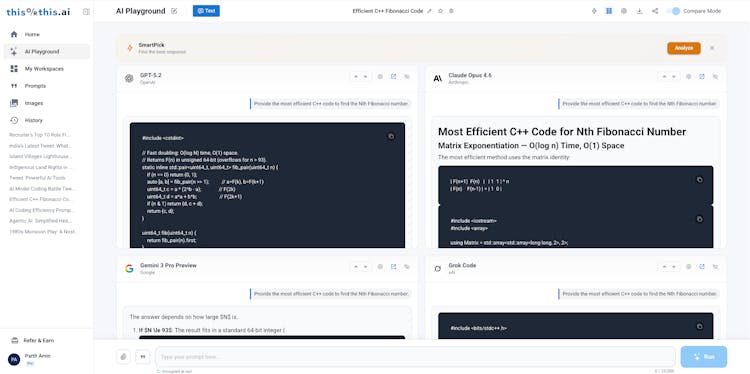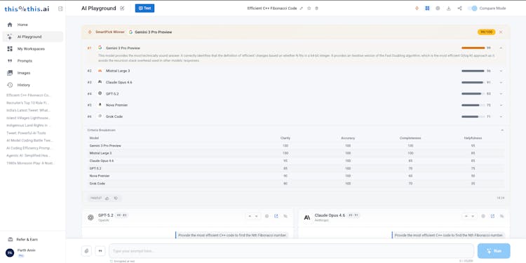 Compare instantly. The AI Playground lets you send one prompt to up to 6 models and see every response side-by-side. SmartPick then scores and ranks them automatically across Clarity, Accuracy, Completeness, and Helpfulness — so you don't have to guess.