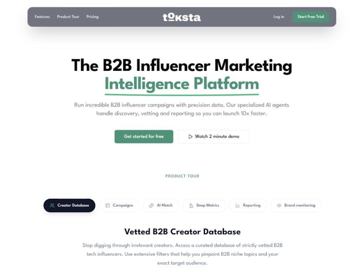 Toksta is an AI-agent-first, data-driven B2B influencer marketing intelligence platform. It uses autonomous AI agents to research, filter, and rank creators while providing deep intelligence on audience demographics and engagement authenticity to help teams launch campaigns 10x faster.