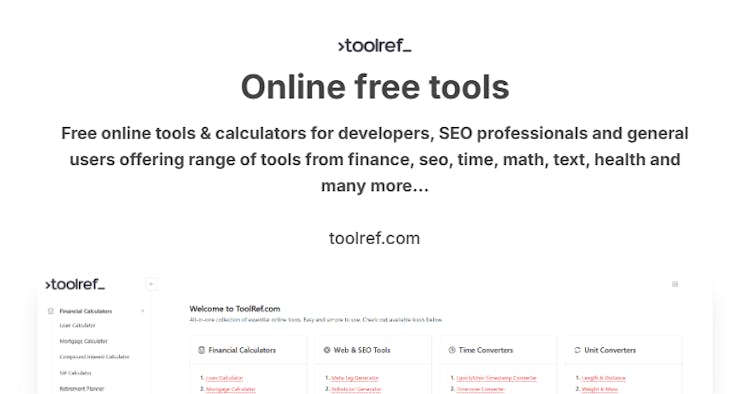 ToolRef.com is a growing collection of completely free, browser-based tools designed for a wide range of use cases. It offers developer utilities like an Epoch Time converter, JSON formatter & validator, HTML beautifier, and URL encoder/decoder. For SEO professionals, it includes tools such as a meta tag generator, robots.txt generator, OG tag builder, and SERP snippet previewer. ToolRef also provides general-purpose tools like mortgage, 401K, and loan calculators, as well as investment-focused tools including compound interest and SIP return calculators.