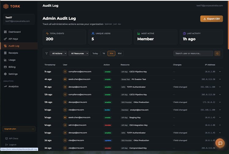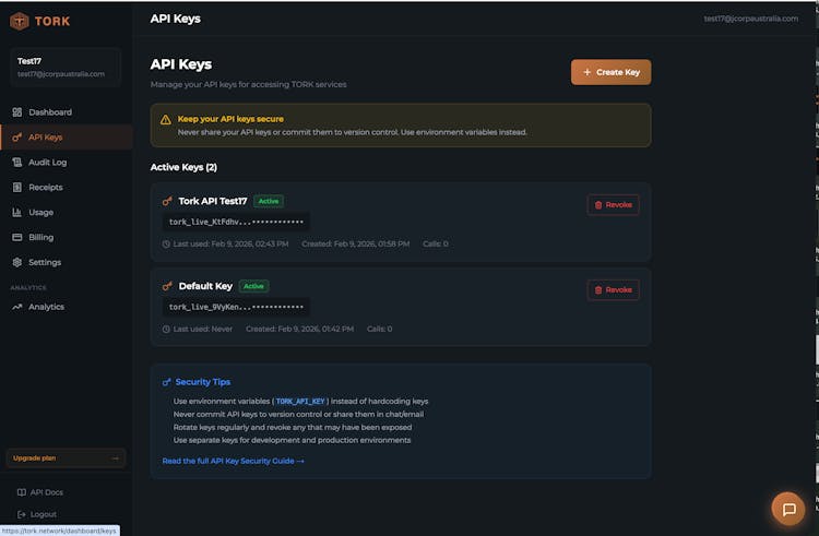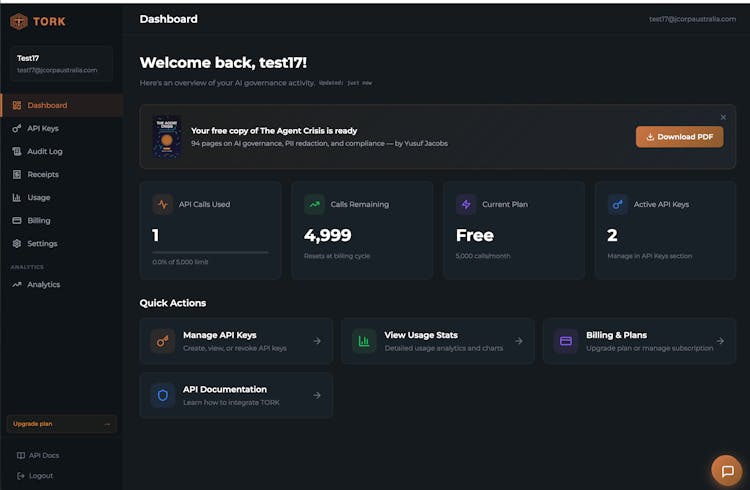 Tork sits between AI agents and the tools they access, providing governance at the middleware layer. Every request gets scanned for PII (50+ patterns, 13 countries, ~1ms), checked against configurable policies, and logged with a cryptographic compliance receipt.