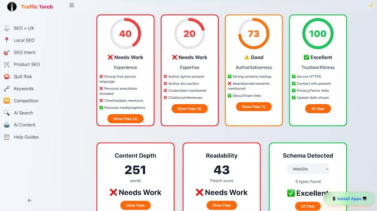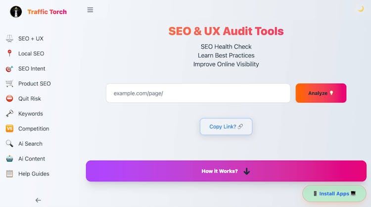 Traffic Torch gives you an instant 360° health score for any website’s SEO and user experience. Enter a URL and within seconds you receive a clear overview with actionable insights and detailed reports.