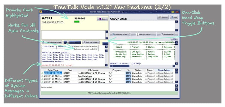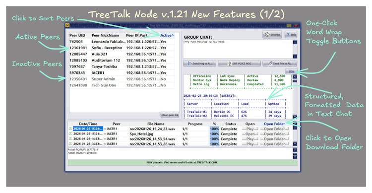 TreeTalk Node lets your team share files up to 55GB, send messages, and exchange voice notes directly over your local network (LAN, WiFi, or VPN). Single portable executable, no installation, no signup. No internet required, no cloud accounts, no external servers, no ads, no trackers. Files transfer peer-to-peer between devices on the same network, so data never leaves your premises. Works during outages, in air-gapped environments, or anywhere cloud tools are blocked or off the table. GDPR and EU NIS2 compliant by architecture, not policy.
