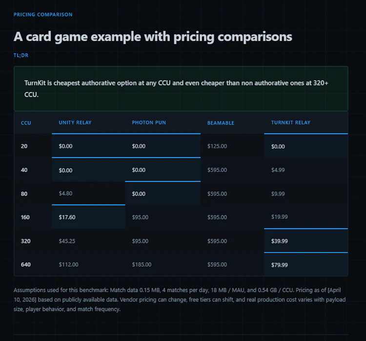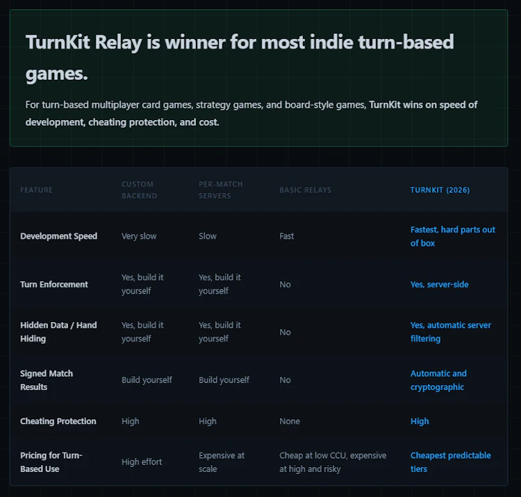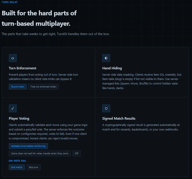Turn-based devs are usually stuck: build a complex authoritative server for months, or use a simple relay with zero cheat protection. TurnKit is the middle ground. We provide a secure backend that stays out of your way. Our Client Consensus voting, State Masking (hiding hands/cards) and Turn enforcment give you professional security without the simulation overhead. Native Unity SDK, but works with any engine. Comes with Leaderboards too. Free up to 20 CCU. Simple CCU only pricing after.