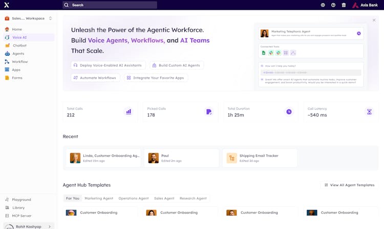 Using a no-code AI agent builder, conversational AI, and intelligent workflow orchestration, teams can go from an idea to a live Voice AI agent in minutes. The voice agents understand natural speech, respond in real time, and take action during conversations. They can update records, trigger workflows, and log call outcomes automatically, without manual effort.