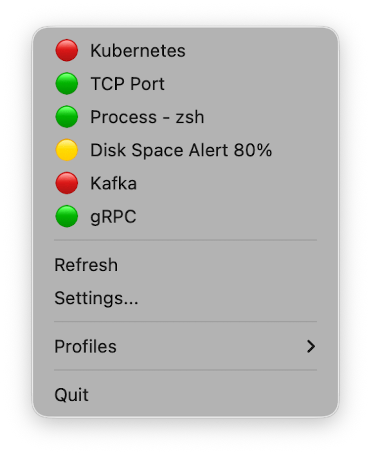 UpDog is a macOS menu bar app that monitors your development environment health at a glance. It checks ports, Docker containers, databases, HTTP endpoints, and more — showing green, yellow, or red status indicators so you always know if your local services are running.