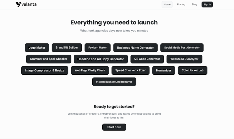 Velanta.io is a suite of AI-powered tools designed to streamline your creative and professional workflows. From instant background removal to grammar checking and color palette generation, we help you achieve professional results with minimal effort.