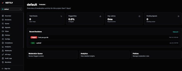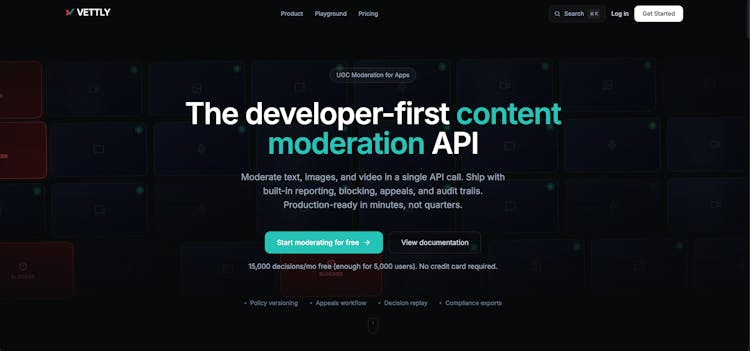 Vettly is a content moderation API built for app developers. One API call to check text, images, or user-generated content against customizable policies.