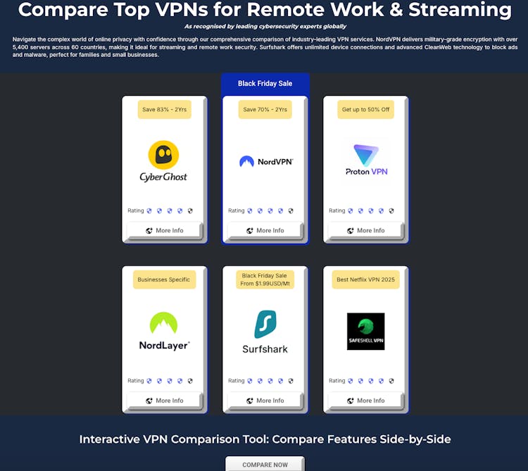 A transparent VPN comparison platform helping you quickly find the best VPN for streaming, security, and remote work.
