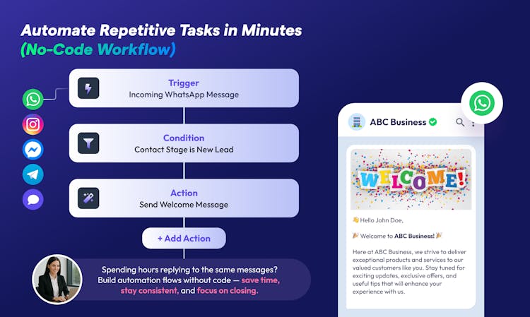 → Build no-code automation workflows to tag, reply, notify, or route chats with zero manual effort.
