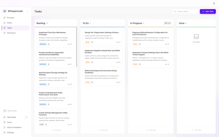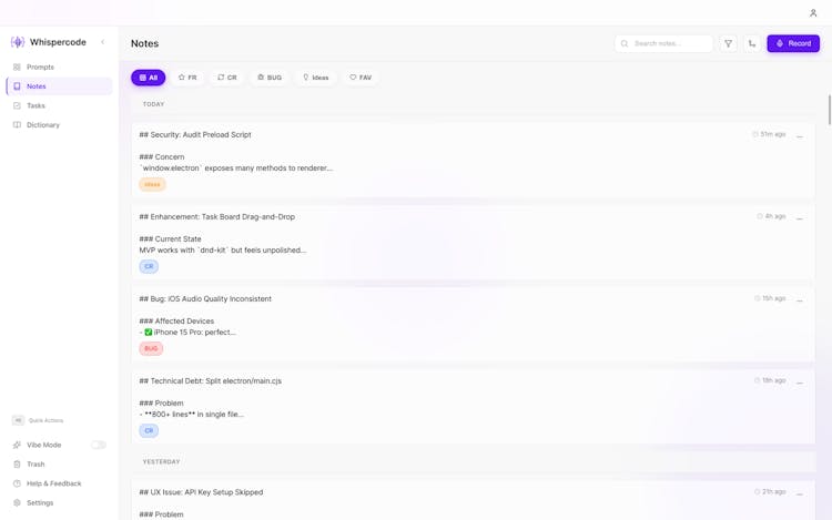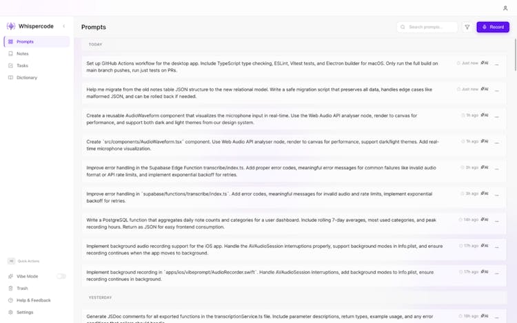 WhisperCode is an AI-powered voice-to-text platform for developers. Record coding ideas, prompts, and notes with your voice - AI automatically formats them into structured, developer-friendly outputs. Features include: global hotkeys (Cmd+Shift+K), VSCode/Cursor extension with context awareness, real-time cross-device sync, technical terminology recognition, and task management. Stop breaking your flow to type prompts. Just speak and code.