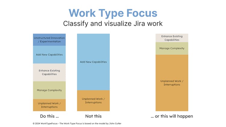 - Work type classification: Add a simple step during Jira issue creation or updates to classify work, making focus visible and measurable.