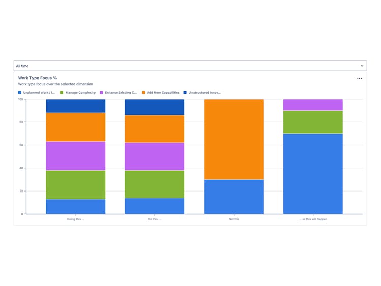 - Balanced workload: Prevent over-focus on features by highlighting technical debt, unplanned work, and innovation.