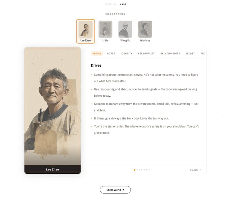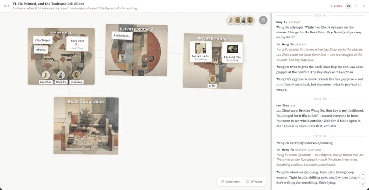 Two scenarios ship out of the box: a teahouse espionage game and a post-layoff tech company drama. The engine is language-agnostic -- build scenarios in any language.