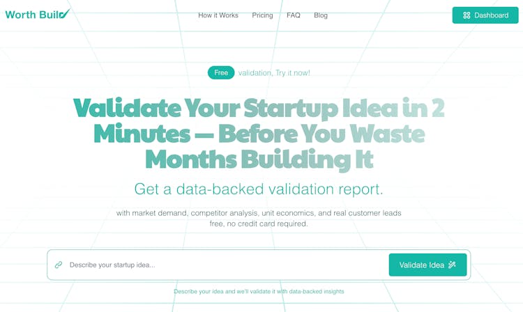WorthBuild.io — AI-powered startup idea validation platform that helps solo founders and indie hackers test their business ideas before building. Get instant market analysis, competitor insights, and viability scores to validate your concept in minutes, not months.
