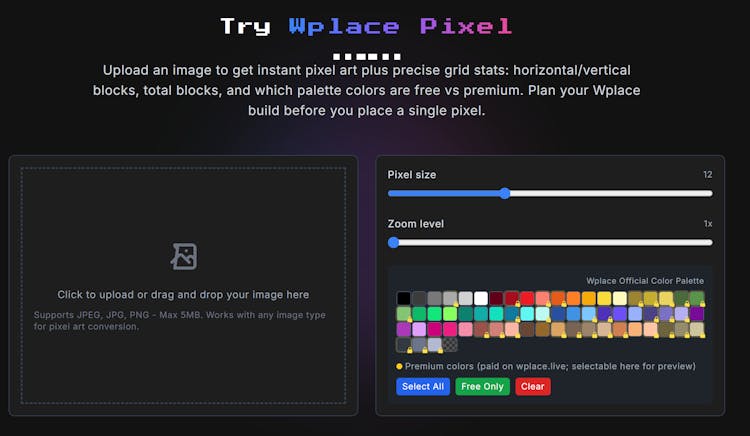 Turn any image into crisp pixel art and see the grid math instantly — pixel size, block counts, and palette costs (free vs premium) for building on wplace.live.