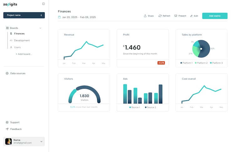 ZapDigits helps startups and founders create dashboards without writing code. You can connect tools like Stripe, GitHub, and Supabase to see your business data in one place. It’s easy to use, fast to set up, and built for small teams who want clear insights without dealing with complex tools. ZapDigits is great for tracking revenue, product activity, and team progress. All in a clean and simple layout.