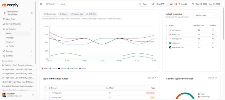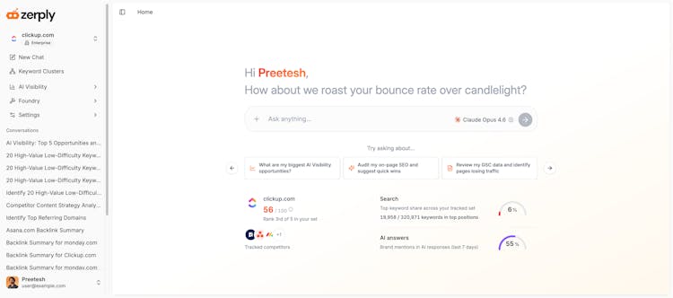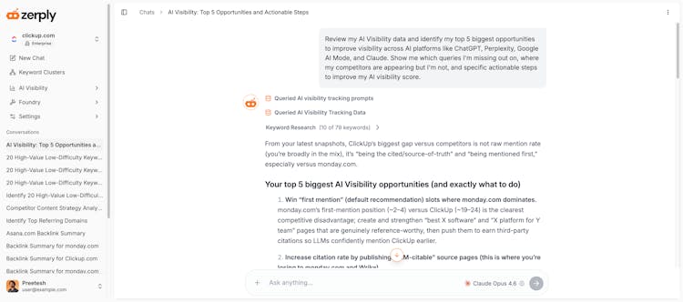 Zerply helps brands win AEO and GEO by tracking AI visibility, finding content gaps, and using agentic workflows with human-in-the-loop approval to create and publish content.