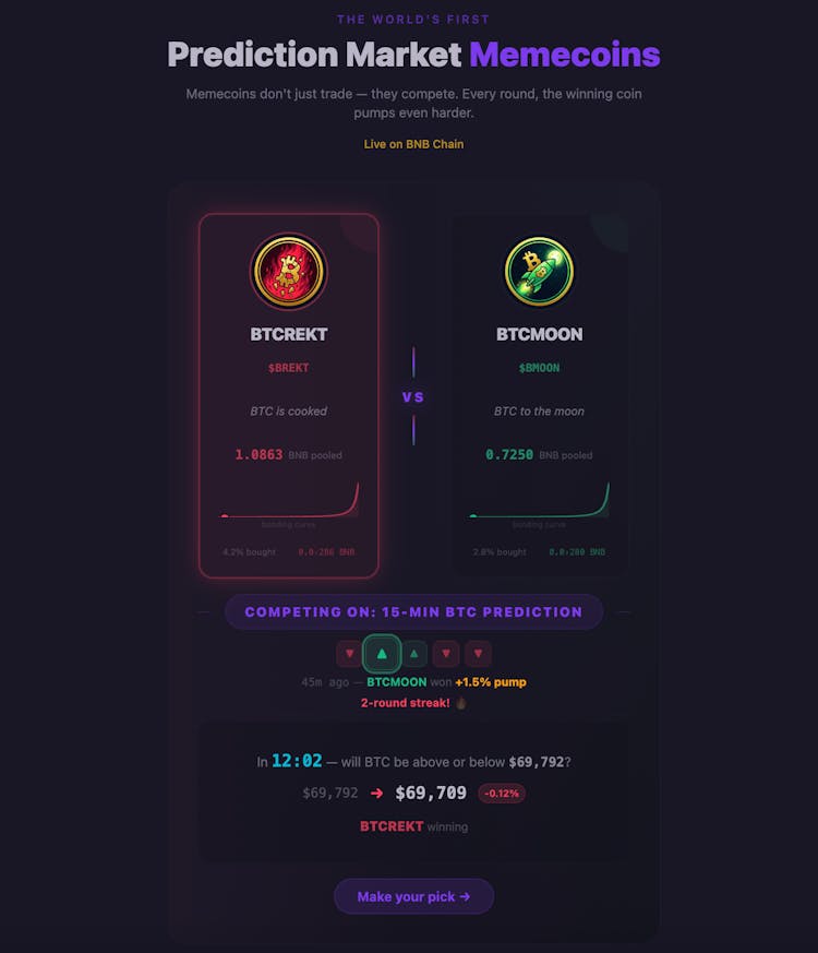 Polymarket meets pump.fun. Kalshi meets four.meme. zopik.fun is the first platform where memecoins are powered by prediction markets. Two tokens on bonding curves go head-to-head battling over a real-time prediction like "Will BTC go up in 15 minutes?" Every round, the winning coin gets a liquidity boost from the losing side. Winning streaks compound. The action never stops. Why it works: Bonding curves are crypto's fastest-growing launch mechanic. Prediction markets are crypto's fastest-growing trading vertical. zopik.fun puts them in the same token — giving traders two reasons to buy and two forces driving price. How it works: - Pick a market — each prediction has two memecoins, one per side - Buy in on the bonding curve — early entry, better price - Every round, the prediction settles — winners pump